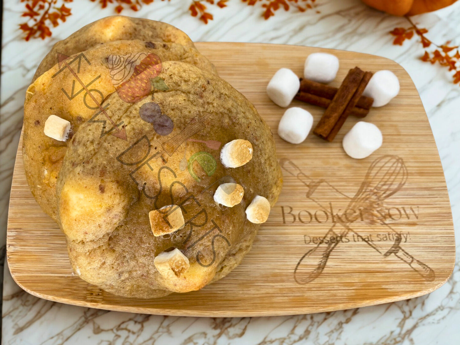 A sweet potato stuffed cookie with vegan marshmallows with crushed pecans throughout. We understand that everybody might not like pork on their fork, so we use vegan marshmallows. The sweet potato gives the cookie a cake like texture while the marshmallow gives it a nice gooey flavor. Let's forget the notes of cinnamon and nutmeg that gives the cookie more fall flavor.